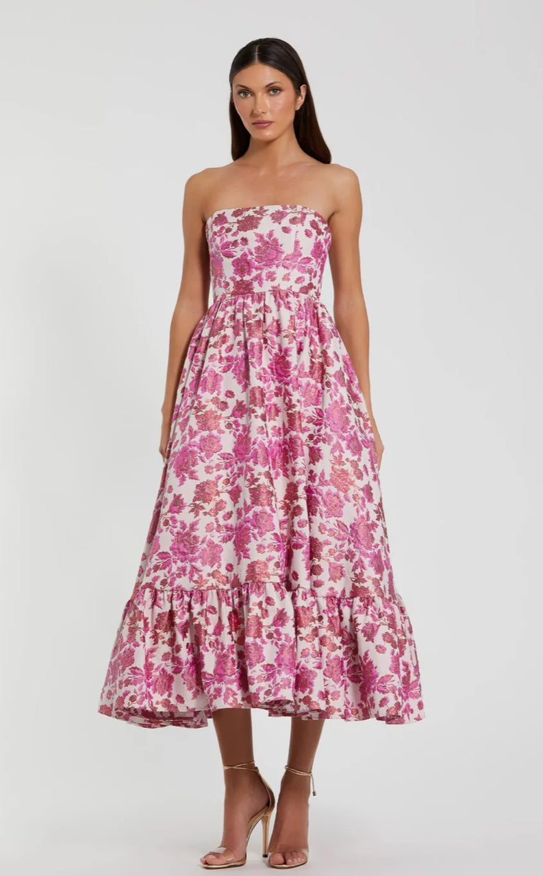 FLORAL BROCADE STRAPLESS A LINE MIDI DRESS