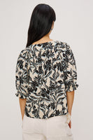 The Belina is an airy, lightly textured poplin top featuring a gathered, peasant-style V-neckline with self ties, a loose, flowing silhouette, and elbow-length sleeves with elastic ruffle cuffs.86% Lyocell | 14% NylonImported.