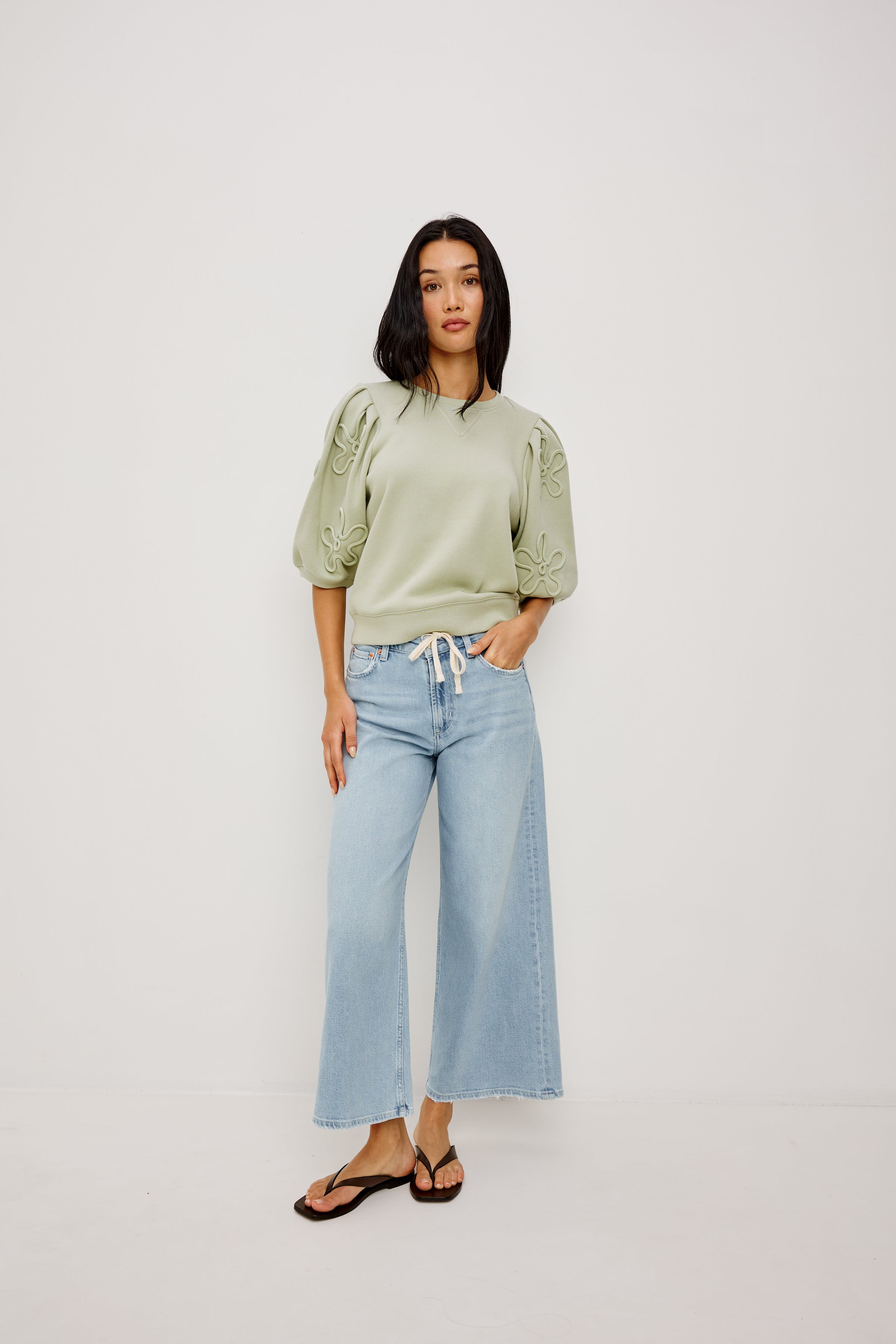 A feminine take on a classic crewneck, the Camy Top is crafted from ultra-soft French terry and finished with soutached florals, puff sleeves, and ribbed trim.100% CottonImported.